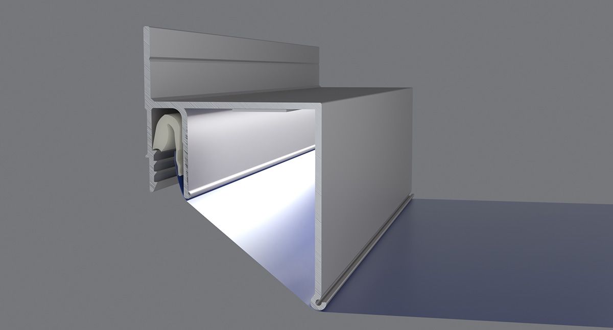 Разработан для создания эффекта «парящего» и «объемного» потолка за счет наклона полотна по периметру под углом и размещения на профиле светодиодных лент.